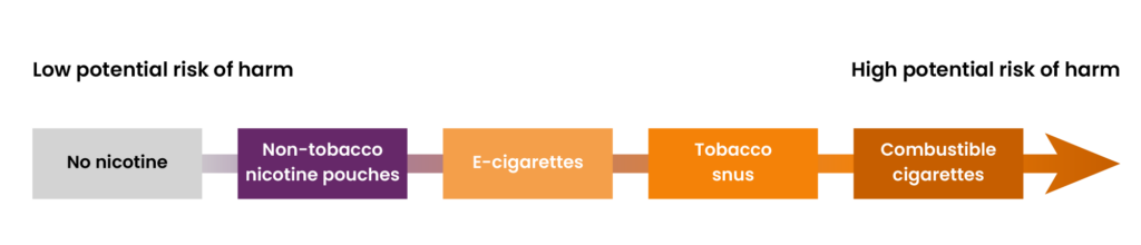 In a 2024 evidence review, the Royal College of Physicians listed oral nicotine pouches as a less harmful alternative to smoking tobacco — second only to medical nicotine replacement therapies9. This was supported by a 2022 systematic review, which suggested that non-tobacco nicotine pouches have a relatively low risk of cancer compared to other nicotine products (see Figure 3)10.